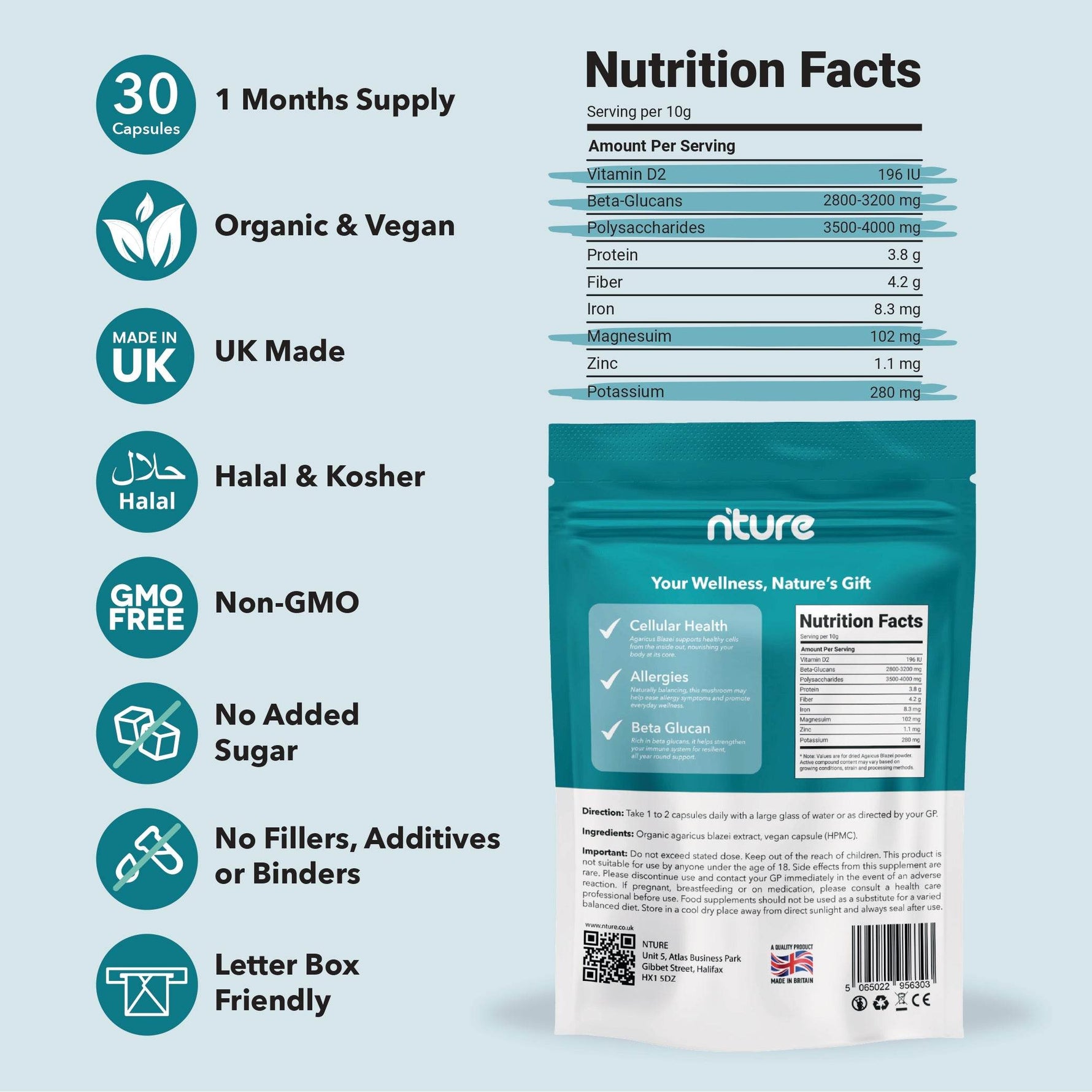 Agaricus blazei is traditionally used for immune support and resilience. It contains beta-glucans and antioxidants that support everyday wellbeing when taken consistently.